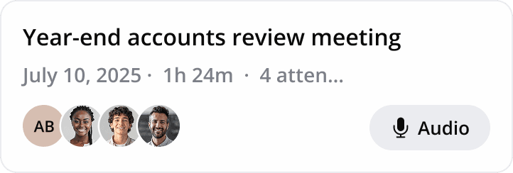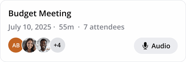 Record in-person meetings on your phone. Whether it's a client visit, or an internal sync, just open the app and hit record.